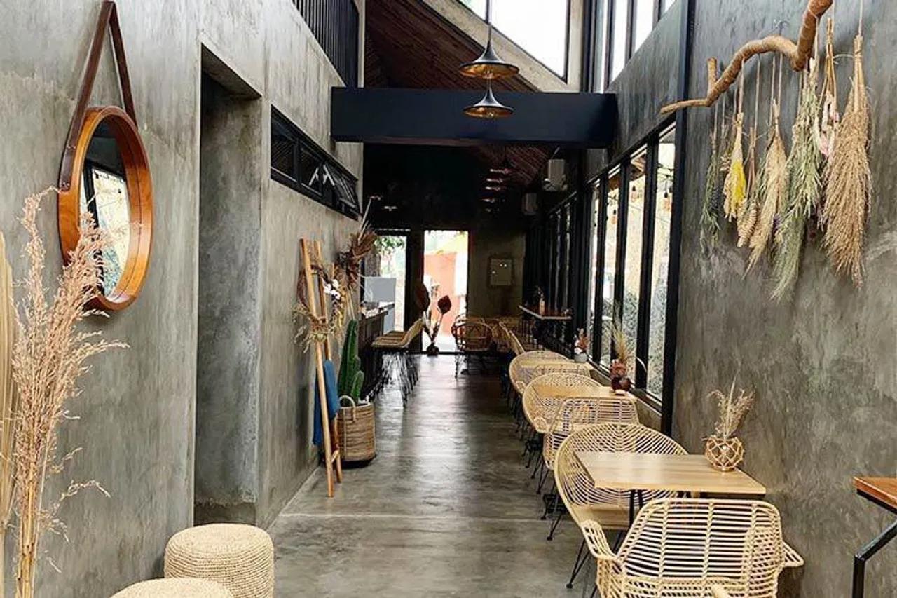 Lekat dengan konsep minimalis, kafe ini didominasi oleh dinding dan lantai unfinished yang memberikan kesan sederhana namun tetap elegan. Kafe yang terletak di daerah Cijantung, Jakarta Timur ini diisi oleh interior yang terbuat dari rotan lengkap dengan ornamen tamanan kering yang menggantung di dinding dan juga meja.